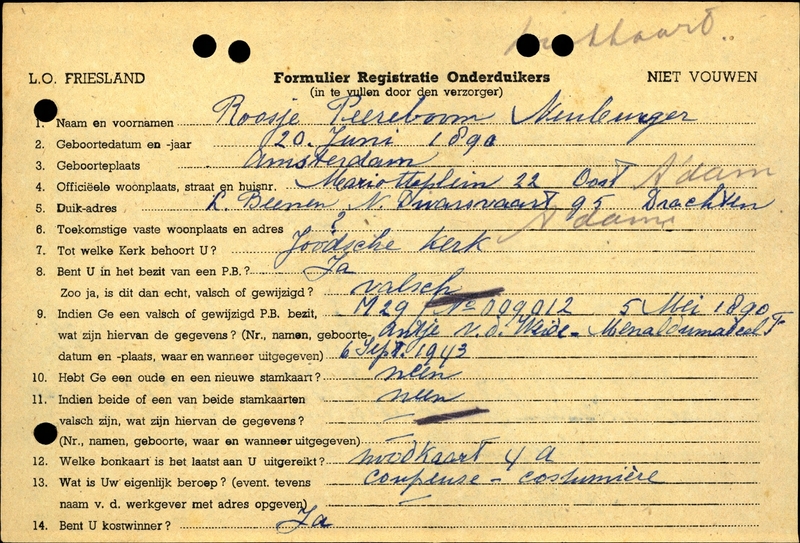 Duikadres: Noorderdwarsvaart 95, Drachten - Oorspronkelijk adres: Mariotteplein 22, Amsterdam-Oost - Reden onderduik: jodenvervolging - Overige opmerkingen: Bijzondere opmerkingen: Laatste bonkaart: noodkaart 4a. Geen steun