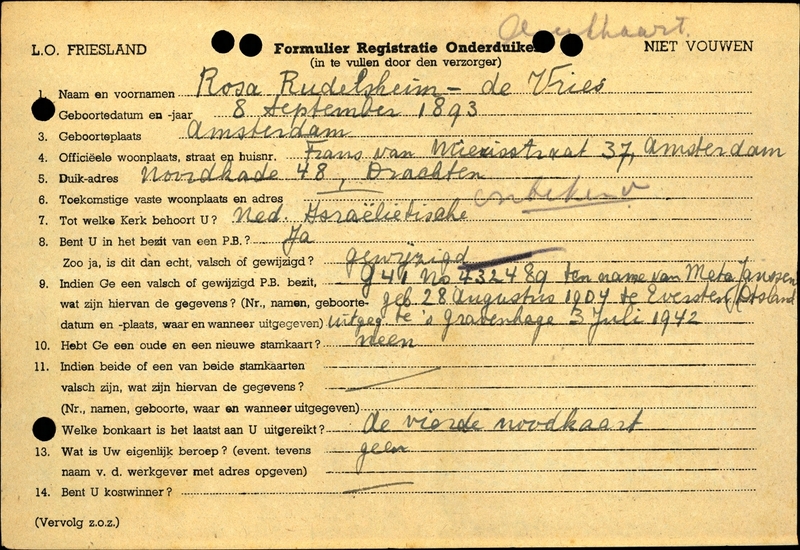Duikadres: Noordkade 48, Drachten - Oorspronkelijk adres: Frans van Mierisstraat 37, Amsterdam - Reden onderduik: jodenvervolging