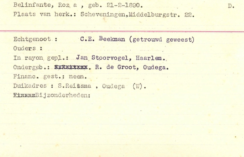 Duikadres: Oudega (Gem. Súdwest-Fryslân) - Oorspronkelijk adres: Middelburgsestraat 22, Scheveningen - Overige opmerkingen: Bijzonderheden: Echtgenoot: C.E Beekman (getrouwd geweest) - Financ. gest.: neen.
