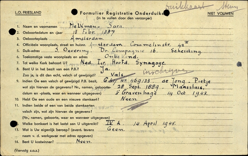 Duikadres: 16 (Scheiding), Drachtstercompagnie - Oorspronkelijk adres: Commelinstraat 42 II, Amsterdam - Reden onderduik: jodenvervolging - Overige opmerkingen: Bijzondere opmerkingen: Ontving steun van W. Mondrian (Almelo) en S. Oevering fl. 40,= op 1 maart 1945