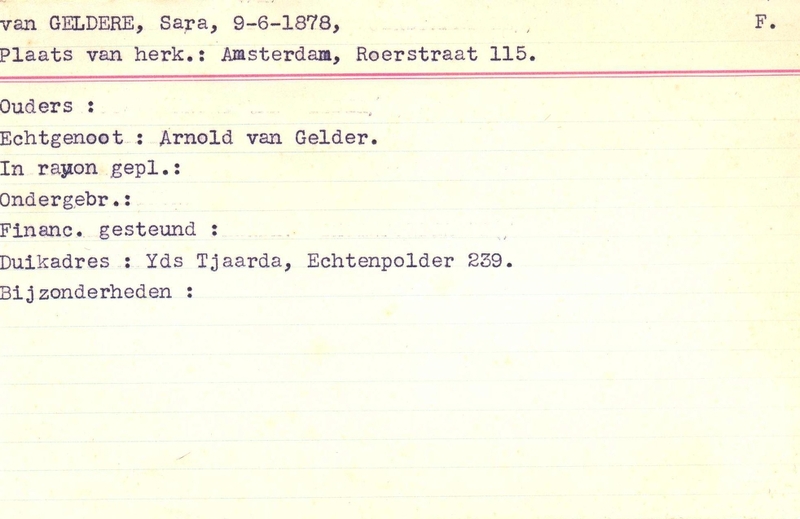 Duikadres: 239, Echtenpolder (Bantega) - Oorspronkelijk adres: Roerstraat 115, Amsterdam - Overige opmerkingen: Bijzonderheden: Duikadres: Echtenpolder. is na de oorlog omgedoopt tot Bantega.