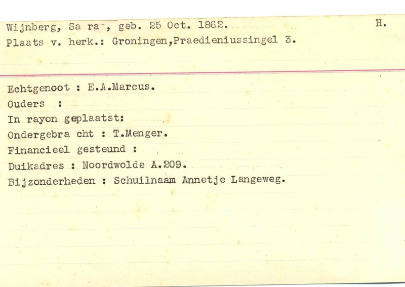 Duikadres: A 209, Noordwolde - Oorspronkelijk adres: Praediniussingel 3, Groningen - Overige opmerkingen: Bijzonderheden: Schuilnaam: Annetje Langeweg.