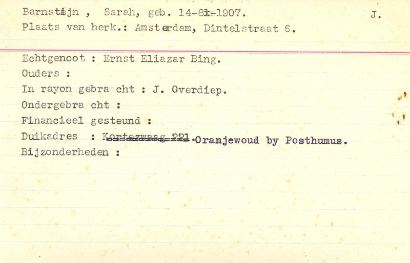 Duikadres: Oranjewoud - Oorspronkelijk adres: Dintelstraat 6, Amsterdam - Overige opmerkingen: Bijzonderheden: Het duikadres Kortezwaag 221 is doorgestreept