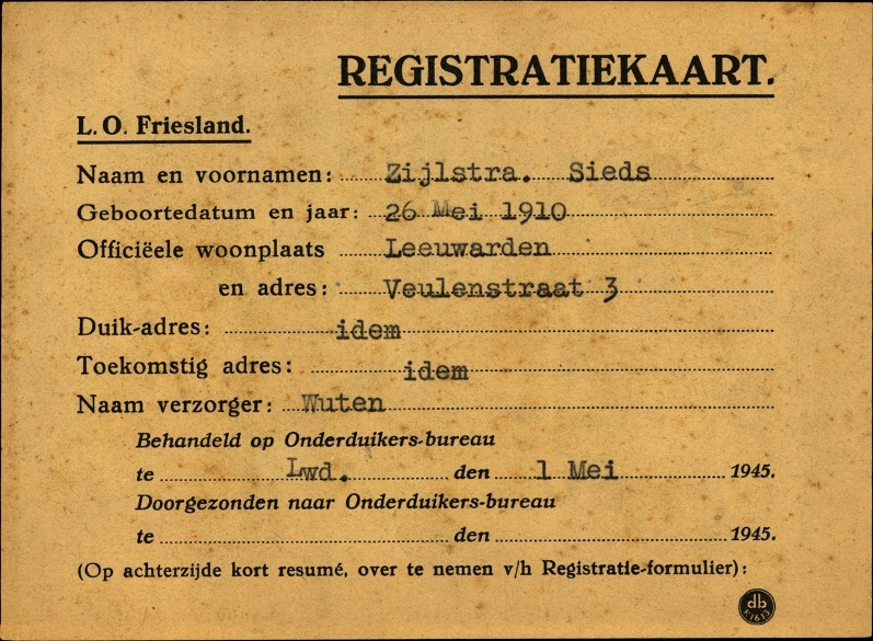 Duikadres: Veulenstraat 3, Leeuwarden - Oorspronkelijk adres: Veulenstraat 3, Leeuwarden - Reden onderduik: anderszins - Overige opmerkingen: Achterkant bijzonderheden: Ondergedoken wegens: was met verlof uit Dtl. en is niet teruggekeerd. Tevens krijgsgevangene. - Alleen nwe. stkrt. - Achterkant beroep: boekbinder