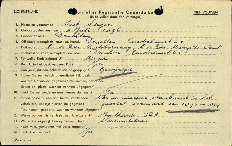 Duikadres: Beetsterzwaag - Oorspronkelijk adres: Zuiderbuurt 65, Drachten - Reden onderduik: anderszins - Overige opmerkingen: Bijzondere opmerkingen: Redenen ondergedoken: Ik had een vrijstelling voor Smilde maar toen mijn P.B. veranderd werd heb ik mijn vrijstelling niet terug gekregen. Bij duikadres ook nog: C de Boer Ureterp a/d Vaart.