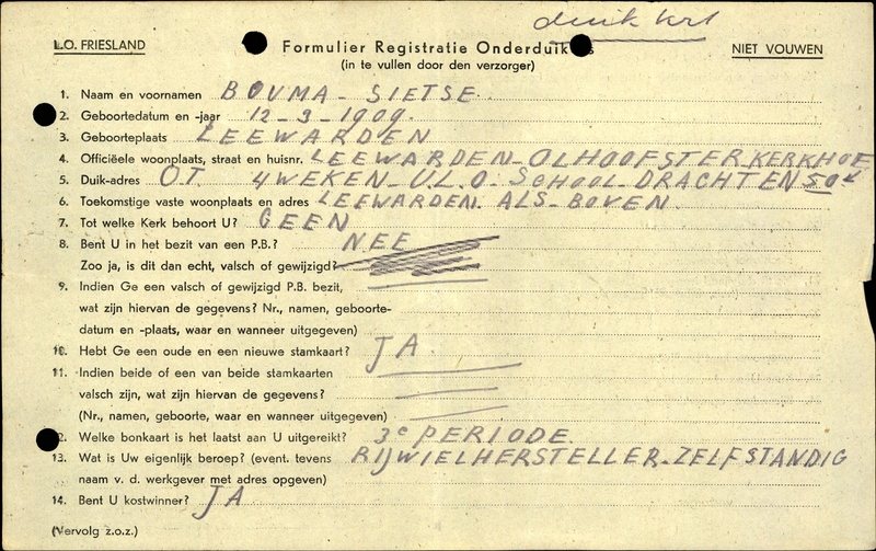 Onderduikinschrijving van Sietse Bouma