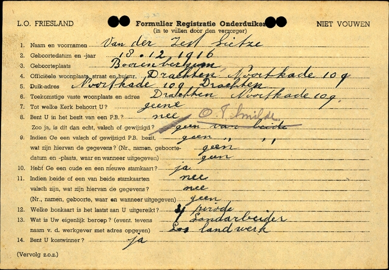 Duikadres: Noordkade 109, Drachten - Oorspronkelijk adres: Noordkade 109, Drachten - Reden onderduik: arbeidsinzet