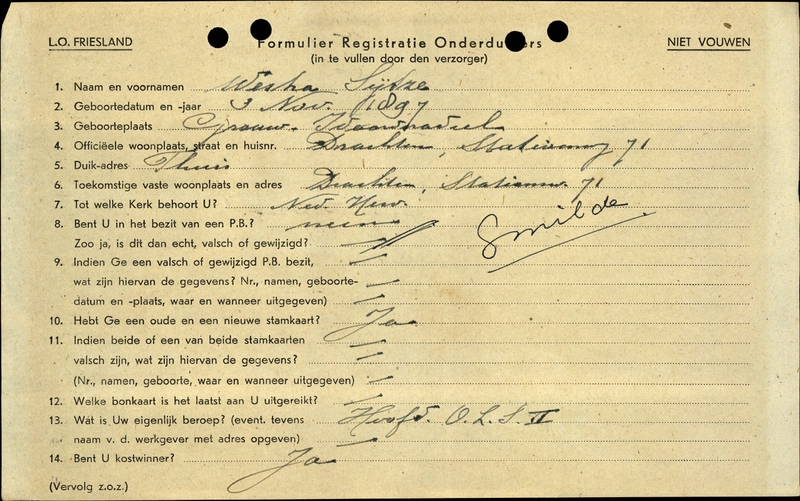 Duikadres: Stationsweg 71, Drachten - Oorspronkelijk adres: Stationsweg 71, Drachten - Reden onderduik: arbeidsinzet - Overige opmerkingen: Bijzondere opmerkingen: bijgeschreven: Smilde