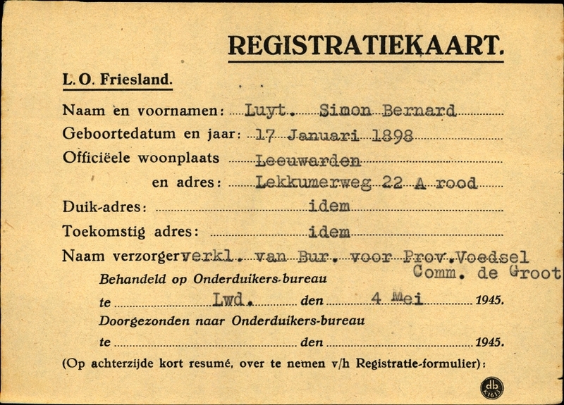 Duikadres: Lekkumerweg 22 A rood, Leeuwarden - Oorspronkelijk adres: Lekkumerweg 22 A rood, Leeuwarden - Reden onderduik: arbeidsinzet - Overige opmerkingen: Achterkant bijzonderheden: De Groot was van Bur. voor Prov. Voedsel Comm. - Beroep: steendrukker. - Ondergedoken wegens A.I. - Gewijzigd P.B. goede stkrt. - Achterkant beroep: Steendrukker - Achterkant naam werkgever: -