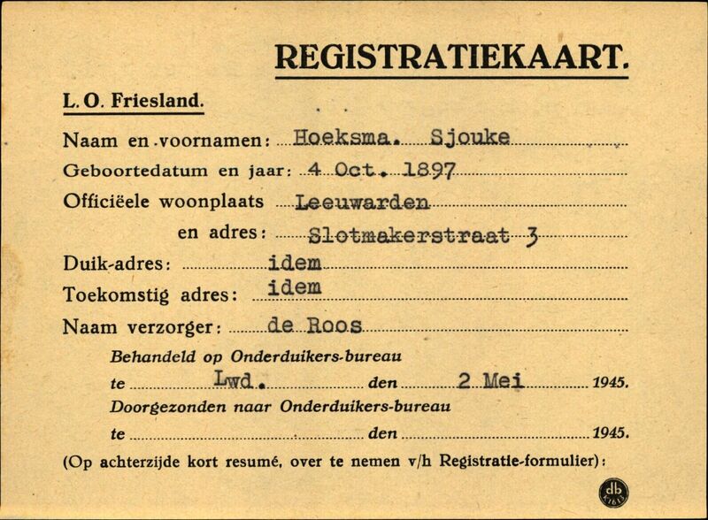 Duikadres: Slotmakersstraat 3, Leeuwarden - Oorspronkelijk adres: Slotmakersstraat 3, Leeuwarden - Reden onderduik: arbeidsinzet - Overige opmerkingen: Achterkant bijzonderheden: Werkzaam geweest als Uurwerkmaker en Opticien. Ondergedoken wegens A.I. - P.B. ingenomen door Afd. Bevolking. Gem. Sectr. (volgens bijgevoegde verklaring van den Heer Pietersen) - Achterkant beroep: Uurwerkmaker en Opticien
