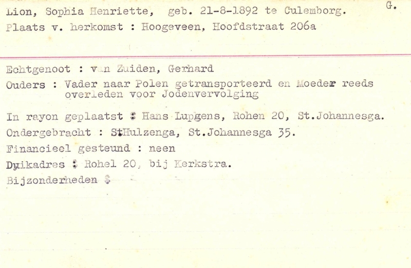 Duikadres: 20, Rohel - Oorspronkelijk adres: Hoofdstraat 206a, Hoogeveen - Overige opmerkingen: Bijzonderheden: Vader naar - Polen getransporteerd.Moeder reeds overleden voor Jodenvervolging -