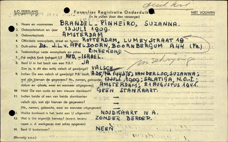 Duikadres: A 44, Boornbergum - Oorspronkelijk adres: Lumeystraat 19, Rotterdam - Reden onderduik: jodenvervolging - Overige opmerkingen: Bijzondere opmerkingen: Gehuwd met J. Brandel. - Geen stamkaart. vals P.B. A 35/ No 144375; van der Loo, Suzanne; 13 juli 1909; Salatiga, N.O.-I; Amsterdam 1941. De vijand heeft beslag gelegd op de inboedel.