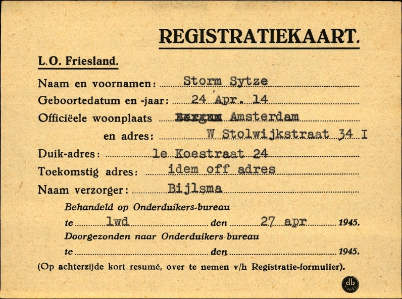 Duikadres: 1e Koestraat 24, Leeuwarden - Oorspronkelijk adres: Stolwijkstraat 34 I, Amsterdam - Reden onderduik: illegaal werk - Overige opmerkingen: Achterkant beroep: Opperwachtmeester - Achterkant naam werkgever: Politie
