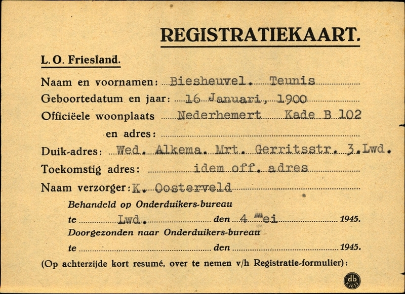 Duikadres: Maarten Gerritstraat 3, Leeuwarden - Oorspronkelijk adres: Kade B 102, Nederhemert - Reden onderduik: arbeidsinzet - Overige opmerkingen: Achterkant beroep: Landarbeider - Achterkant naam werkgever: -