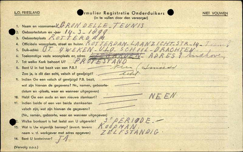 Duikadres: ULO-school, Drachten - Oorspronkelijk adres: Laanzichtstraat 14, Rotterdam - Reden onderduik: anderszins - Overige opmerkingen: Bijzondere opmerkingen: Ondergedoken voor 4 weken in de ULO School te Drachten - reden onderduik: ieder-vlughtte. - Bijz. opm.: Opgepakt-razia-koffer-2 stel ondergoed. 1 paar klompen
