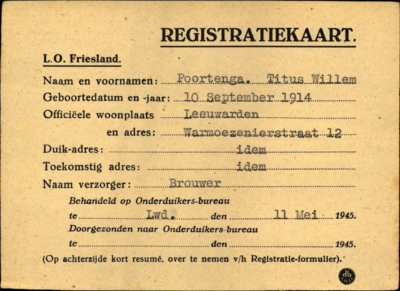 Duikadres: Warmoezenierstraat 12, Leeuwarden - Oorspronkelijk adres: Warmoezenierstraat 12, Leeuwarden - Reden onderduik: arbeidsinzet - Overige opmerkingen: Achterkant beroep: monteur kantoormachines