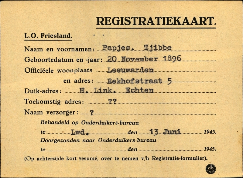Duikadres: Echten - Oorspronkelijk adres: Eekhoffstraat 5, Leeuwarden - Reden onderduik: arbeidsinzet - Overige opmerkingen: Achterkant bijzonderheden: Duik-adres: H. Link - Achterkant beroep: oppermanberoep: Opperman