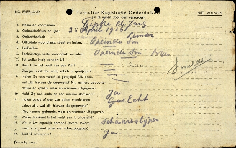 - Oorspronkelijk adres: B46, Opeinde - Reden onderduik: arbeidsinzet