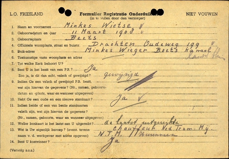 Onderduikregistratie van Wietse Minkes