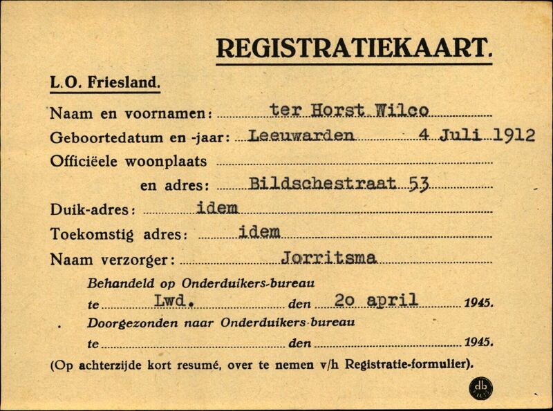 Duikadres: Bildtsestraat 53, Leeuwarden - Oorspronkelijk adres: Bildtsestraat 53, Leeuwarden - Reden onderduik: anderszins - Overige opmerkingen: Achterkant bijzonderheden: Ondergedoken wegens Org. T. - Achterkant beroep: Ambtenaar - Achterkant naam werkgever: alg. Fr.
