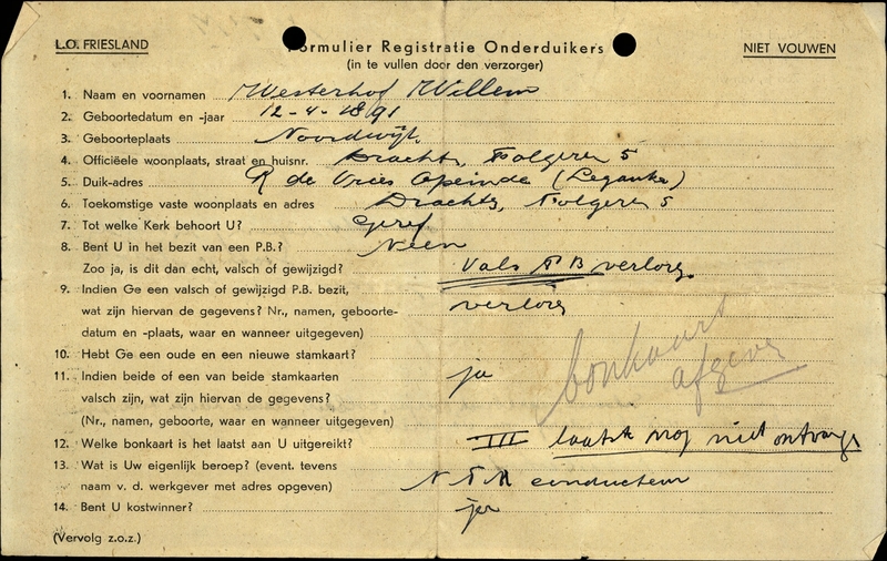 Duikadres: Stationsweg 233, Drachten - Oorspronkelijk adres: Weltevredenstraat 22bis, Utrecht - Reden onderduik: arbeidsinzet
