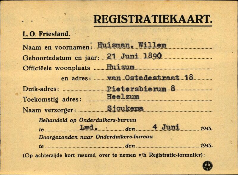 Duikadres: 18, Pietersbierum - Oorspronkelijk adres: Van Ostadestraat 18, Huizum - Reden onderduik: staking - Overige opmerkingen: Achterkant bijzonderheden: Spoorwegstaking. - Goede stkrt. - Achterkant beroep: Hoofdconducteur - Achterkant naam werkgever: N.S.