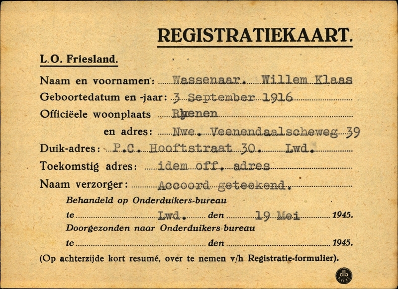 Onderduikinschrijving van Willem Klaas Wassenaar