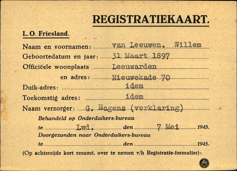 Duikadres: Nieuwekade 70, Leeuwarden - Oorspronkelijk adres: Nieuwekade 70, Leeuwarden - Reden onderduik: arbeidsinzet - Overige opmerkingen: Achterkant bijzonderheden: Naam verzorger: G. Hagens (verklaring) - Achterkant beroep: scheepsmonteur