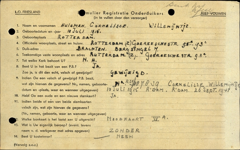 Onderduikregistratie van Willemijntje Cornelisse