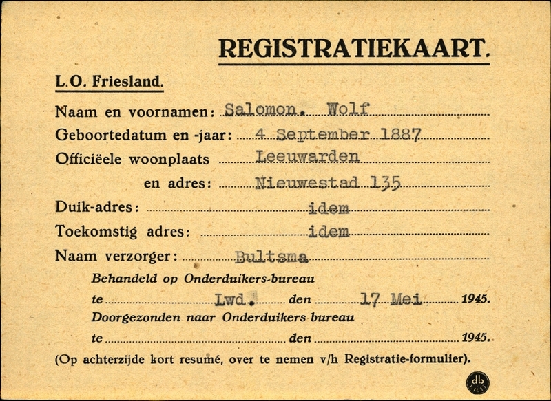 Duikadres: Nieuwestad 135, Leeuwarden - Oorspronkelijk adres: Nieuwestad 135, Leeuwarden - Reden onderduik: jodenvervolging - Overige opmerkingen: Achterkant bijzonderheden: Toekomstig adres: idem - - Behandeld op Onderduikers-bureau te Lwd. den 17 Mei 1945. - valsch PB, geen stkrt. - Achterkant beroep: winkelier in mode-artikelen