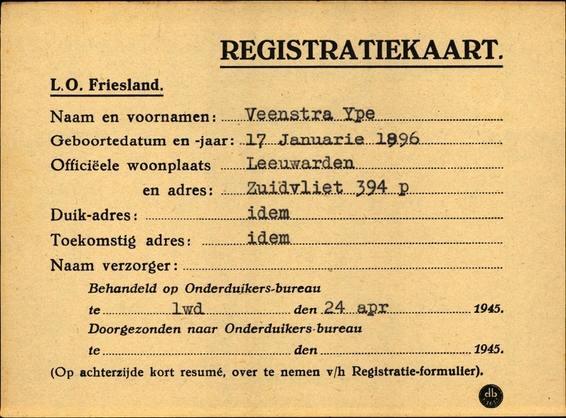 Duikadres: Zuidvliet 394 p, Leeuwarden - Oorspronkelijk adres: Zuidvliet 394 p, Leeuwarden - Reden onderduik: arbeidsinzet - Overige opmerkingen: Achterkant beroep: expeditieknecht - Achterkant naam werkgever: -