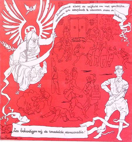 In de prent zijn Nazisme en Censuur verwerkt. Het nationaalsocialisme, bekend als nazisme, is een fascisme-gerelateerde ideologie die in Duitsland kort na de Eerste Wereldoorlog opkwam. Het symbool van de swastika, afkomstig uit de Indusbeschaving, is terug te vinden in diverse Euraziatische culturen en werd door Hitler en de nazi's als hakenkruis ingezet.Fascisme en censuur op spotprentOp de prent is een bovenschrift te lezen: De goeie ouwe tijd komt weerom. De ondertitel leest: 'En nou allemaal... Maul halten!'.De weergegeven spotprent is uitgegeven op 18-03-1933. De handtekening van Tjerk Bottema is links midden geplaatst. De prent heeft een afmeting van ca. 28 bij 18 centimeter.Tjerk Bottema werkend bij weekkrant De Notenkraker droeg bij aan de uitgave van vele originele satirische prenten gericht aan arbeiders en SDAP-leden. Deze prent is bijna honderd jaar oud. Het papier kan op plekken beschadigd zijn, zie de foto's voor de details om te zien wat de exacte staat van de prent is.