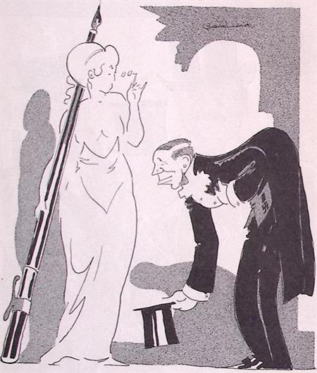 Op de prent zijn Cornelis Jacobus Snijders en William Westerman te zien. Cornelis Jacobus Snijders, geboren in 1852 in Nieuwe-Tonge, was een vooraanstaand Nederlands generaal en politicus. Hij stierf in 1939 in Hilversum. William Marten Westerman (1892-1950) was een Nederlands politicus en bankier, geboren in Kisaran, Nederlands-Indië, en gestorven in Gouda. Op deze prent is de VNH afgebeeld. Het Verbond voor Nationaal Herstel (VNH) was een autoritaire, rechtse Nederlandse partij die zich inzette voor krachtig gezag en tegen partijpolitiek ageerde. Een thema in deze prent is Fascisme. Fascisme, een extreemrechtse ideologie, staat bekend om zijn autoritaire nationalisme en vijandigheid tegenover democratie, communisme, liberalisme en parlementarisme.Westerman omhooggehouden door het VNH op spotprentHet bovenschrift leest: Daar komt de sterke man!. Op de prent is een ondertitel te lezen: De glorieuze intocht van het Nationaal herstel.De weergegeven spotprent is uitgegeven op 06-05-1933. Op de prent is rechts boven de handtekening van Albert Hahn Jr aanwezig. De afmeting van deze prent is ca. 28 bij 23 centimeter.Bij het Nederlands satirisch-politiek weekblad De Notenkraker maakte Albert Hahn Jr talloze originele omslagen, tekeningen en beeldverhalen. Deze prent is bijna honderd jaar oud. Het papier kan op plekken beschadigd zijn, zie de foto's voor de details om te zien wat de exacte staat van de prent is.
