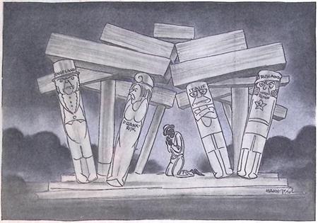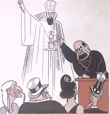 Danzig voor de Volkenbond op spotprent.Het bovenschrift leest: Danzig voor de Volkenbond. Op de prent is een ondertitel te lezen: Ik zal 't nooit weer doen!.De datum van uitgeving is 01-02-1936. De handtekening van Tjerk Bottema is boven te vinden.Tjerk Bottema werkend bij weekkrant De Notenkraker droeg bij aan de uitgave van vele originele satirische prenten gericht aan arbeiders en SDAP-leden. Deze prent is bijna honderd jaar oud. Het papier kan op plekken beschadigd zijn, zie de foto's voor de details om te zien wat de exacte staat van de prent is.