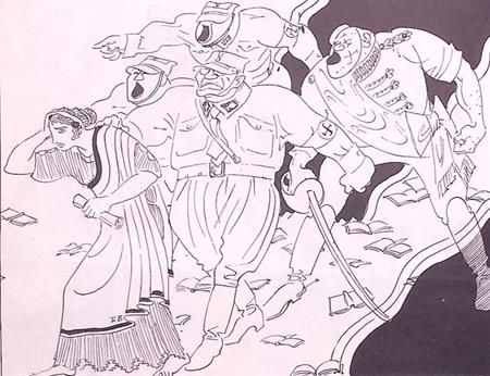 De prent gaat over Nazisme en Censuur. De ideologie van het nationaalsocialisme, ook wel nazisme genoemd, heeft haar oorsprong in Duitsland kort na de Eerste Wereldoorlog en is verwant aan het fascisme.Spotprent over nazisme en censuur in Duitsland.Op de prent is een bovenschrift te lezen: Het Derde Rijk. Op de prent is een ondertitel te lezen: Als Duitschland heelemaal gezuiverd zal zijn.Deze spotprent kwam uit op 08-04-1933. Op de prent is links onder de handtekening van George van Raemdonck aanwezig. De afmeting van deze prent is ca. 16 bij 13 centimeter.George van Raemdonck maakte deze spotprent als onderdeel van de weekkrant De Notenkraker. Deze krant was een Nederlands politiek-satirisch weekblad, altijd voorzien van originele spotprenten. Deze prent is bijna honderd jaar oud. Het papier kan op plekken beschadigd zijn, zie de foto's voor de details om te zien wat de exacte staat van de prent is.