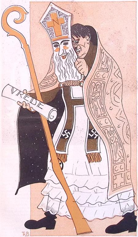 Op deze prent is Sinterklaas afgebeeld. Het sinterklaasfeest draait om Sinterklaas, ook bekend als Sint-Nicolaas of de Goedheiligman, wiens verjaardag traditioneel op 6 december gevierd wordt.Bedroefde Sinterklaas op spotprent.Op de prent is een bovenschrift te lezen: Sinterklaas 1933. Op de prent is een ondertitel te lezen: ,,En de kinderen zullen denken, dat het mijn schuld is'.De weergegeven spotprent is uitgegeven op 02-12-1933. De handtekening van Funke Küpper is links onder te vinden.Mooie spotprent, gemaakt door Funke Küpper als onderdeel van de weekkrant De Notenkraker. Deze Nederlandse krant bracht veel politiek satirische prenten uit in een weekblad. Deze prent is bijna honderd jaar oud. Het papier kan op plekken beschadigd zijn, zie de foto's voor de details om te zien wat de exacte staat van de prent is.