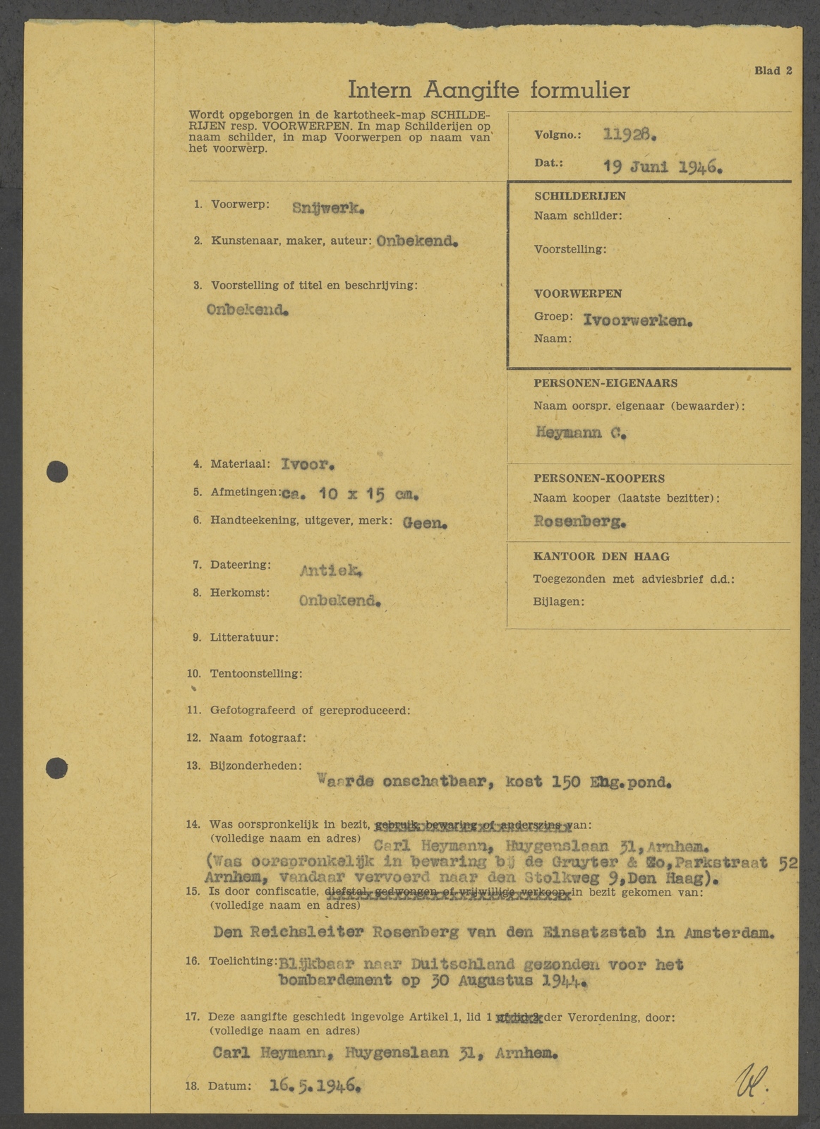 Aangifteformulier - Aangiftedatum: 1946-05-29 - Aangiftenaam: Aalderink, J. - Aangiftenummer: 11213 - Aangifteplaats: Amsterdam - Status: vrijwillige verkoop