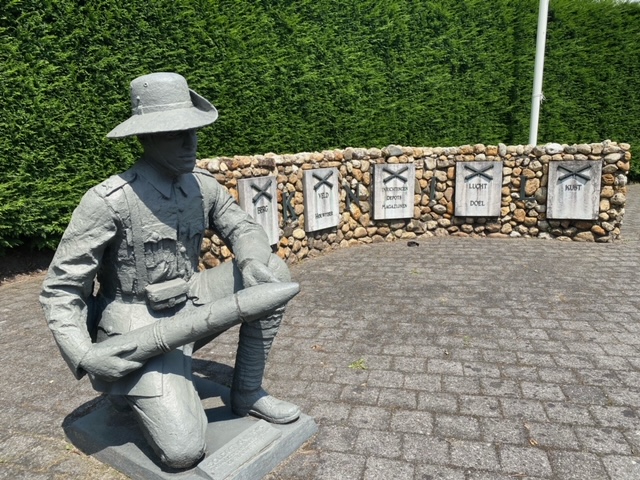 ‘De Wachters’ in Venlo waarschuwen tegen agressie, geweld en oorlog. Ze dienen als symbolische hoeders van de stad Venlo. Na een voorspoedige opmars door Noord-Frankrijk en België waren de Amerikanen van de 30ste infanterie 'Old Hickory' erin geslaagd het grootste deel van Zuid-Limburg te bevrijden. Vervolgens wilden de geallieerden op 17 september 1944 met een groot offensief (operatie 'Market Garden') vanuit België een bruggenhoofd over de grote rivieren in Nederland veroveren. Luchtlandingstroepen moesten in een bliksemsnelle aanval bruggen in Noord-Brabant en Gelderland veilig stellen. Vanuit België moesten grondtroepen over de veroverde bruggen naar het IJsselmeer optrekken. Er werden drie complete divisies gedropt: de 101ste US Airborne Divisie bij Eindhoven en Veghel, de 82ste US Airborne Divisie bij Grave en Groesbeek en de 1ste Britse Airborne Divisie bij Arnhem en Oosterbeek. Bij de Amerikanen verliep alles vrij goed. De bruggen over de Maas en het Maas-Waalkanaal bij Heumen en de meeste bruggen nabij Eindboven vielen in hun handen en na harde strijd ook de Waalbrug bij Nijmegen. Maar de Rijnbrug bij Arnhem bleek een brug te ver. De Britse para's werden verrast door Duitse pantsertroepen en moesten zich onder zware verliezen terugtrekken in de Betuwe. Op 19 september stagneerde ook de Amerikaanse opmars in Zuid-Limburg, enkele kilometers ten noorden van Sittard. De frontlinie liep nu dwars door Limburg. In de daaropvolgende maanden ontstond in dit gebied een zware en bloedige strijd, waaronder de burgerbevolking zwaar te lijden had. Ook Venlo lag in de frontlinie. De geallieerden vochten zich vanuit de Peel moeizaam een weg naar de Maas. Naarmate de bezetters steeds verder naar hun eigen rijksgrens werden teruggedrongen, werden zij steeds taaier en fanatieker. De brug over de Maas tussen Venlo en Blerick werd vanwege haar strategisch belang tussen 13 oktober en 19 november 1944 herhaaldelijk gebombardeerd. De bevolking leed zwaar onder deze voortdurende bombardementen. Dieptepunten waren 4 en 5 november. In het najaar van 1944 hield Martien Blondel (pseudoniem voor Gijs Bertels) een dagboek bij. Zijn relaas over de gebeurtenissen in het najaar van 1944 zijn vastgelegd in de publicatie Die swaere noodt . Blondel noteerde in zijn dagboek: 'Zondag, 5 november 1944. Het Venlose hart roept ach en wee. Van de ene kant tot de andere waggelen boven de stad logge vlammen. Ons lief heem brandt en in de onrustige ademtocht van de nachtwind gloeien de rossige schijnsels zo ver langs het wolkendek, dat heel Noord-Limburg moet weten: de stad van Valuas brandt. De oorlogsgod heeft zijn fakkel in het hart van Venlo gestoten. [...] Andermaal sloegen de bommen ver bezijden het doel in de binnenstad rondom de Sint-Nicolaaskerk. De meisjesscholen in de Grote Kerkstraat stortten in boven de kelders, waar tientallen kloosterzusters opgesloten raakten. In het midden van de stad begon het hier en daar te branden. Vonken zwierden met de storm door de vernielde ramen van de Klaaskerk. De waterleidingen waren kapot. Bluswater moest van ver worden opgepompt. De vuurgloed wakkerde aan tot een ronkende en ziedende hel. Een orkaan van vonken joelde over een stad, die met haar vensterloze huizen en stukgeschoten daken open lag voor iedere kiem van vuur. Dit kon de volledige ondergang worden.' Maar de wind ging liggen en een hevige regenval maakte een einde aan de vuurzee. Circa 16.000 Venlonaren waren gevlucht naar dorpen ten noorden en ten zuiden van de stad. Plunderingen braken uit en Venlo raakte in een toestand van ontreddering en anarchie. Ook het voedselgebrek was dramatisch. Het laatste en tevens zwaarste bombardement trof Venlo op zondag 19 november 1944. Twintig burgers kwamen hierbij om het leven. Op 25 november 1944 blies de bezetter de Maasbrug op. Het officiële dodental als gevolg van de bombardementen was inmiddels opgelopen tot 333. Op 3 december 1944 werd het stadsdeel Blerick na een zwaar gevecht tussen de Britten en de bezetter bevrijd. De Britten bleven in Blerick hun wonden likken. Venlo zou nog maandenlang bezet blijven. Omdat Noord- en Midden-Limburg in de frontlinie lagen, besloot de bezetter een evacuatiebevel voor dit gebied uit te vaardigen. Ook Venlo werd ontruimd. Treinen vol evacués vertrokken naar Groningen, Friesland en Drenthe, waar de Limburgers werden ondergebracht bij particulieren. Na alle doorstane ellende in Limburg werden ze in het hoge noorden in de loop van de maand april vrijwel geruisloos door de Canadezen bevrijd. De Maasbrug werd tijdens het laatste bombardement op 25 november 1944 geheel verwoest. In 1957 is de brug herbouwd. Oprichting Aanleiding voor de oprichting van het monument was het 50-jarig jubileum van de Maasbrug. Onthulling Het monument is onthuld op 2 mei 2007, door Hare Majesteit Koningin Beatrix.