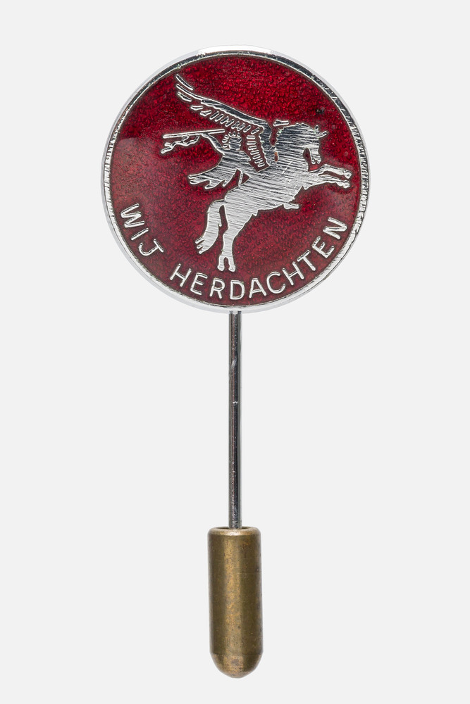 Een zilverkleurige herdenkingsspeld met hierop het Airborne Monument (gedenknaald) in Oosterbeek.