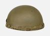 Een Brits model (HSAT, first pattern) metalen parahelm, met leren binnenwerk, voor gebruik door luchtlandingstroepen. De helm is groen overgespoten. De helm heeft stootrand aan de buitenzijde, een leren hoofdband en een leren kinband. Op het leren binnenwerk geen vervaardigersmerktekens.
