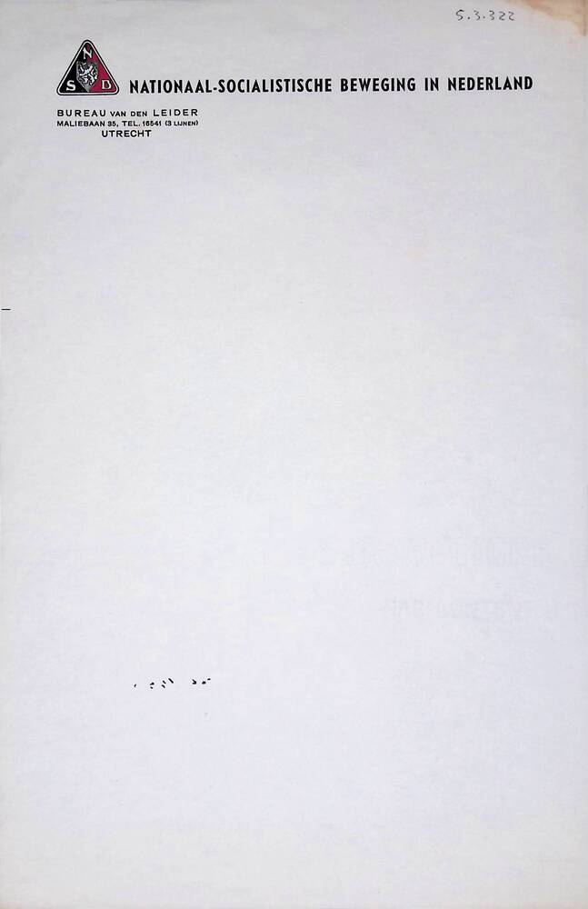 Vel briefpapier, blanco, met briefhoofd "Weerafdeling der N.S.B., Stafkwartier: Maliebaan 76 Tel: 20141-20142, Postbus 70 Utrecht"