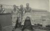 Indië; drie Nederlandse militairen aan dek van een passagiersschip. Passagiersschip op de achtergrond