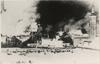 Foto stad die in brand staat met park op de voorgrond en toren rechts. tekst: "Brand v/d land v. Hoboken" (het gaat hier om Rotterdam na het bombardement van 14 mei 1940. De toren rechts is die van Museum Boymans van Beuningen).
