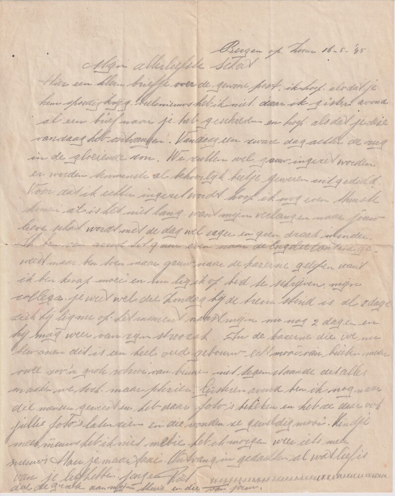 Correspondentie tussen Piet van Haarlem en Dick Snijders (zijn vriendin Dirkje, roepnaam 'Dick'). (zijn vriendin Dirkje, roepnaam 'Dick').Brief vanuit : In Velde 9 mei 1945.De eerste brief via de veldpost.Hij schrijft over de lang verwachte bevrijding die dan toch eindelijk is gekomen en de feesten die worden gehouden.Hij vindt het spijtig dat hij niet bij haar kan zijn om de feesten samen mee te vierenIn de brief verteld hij dat ze een dancing hebben bezocht en dat daar meer gehost en gesprongen wordt dan gedansd.Hij heeft daar een familie "ontdekt" waar hij als hij 's avonds even vrij is aanwipt, waar hij even in een stoel kan zitten en naar de radio kan luisteren.deze ontmoeting vond plaat in de winkelstraat waar een meneer hen uitnodigde om naar het nieuws te komen luisteren, omdat zojuist is doorgekomen dat de oorlog in Holland is afgelopen.Verder omschrijft hij de situatie in en om de kazerne en de uitgelaten menigte maar dat ook nog tucht en discipline wordt vereist.Ook omschrijft hij zijn verlangen om thuis bij zijn geliefde te zijn.hij maakt melding van het warme weer en dat zij moeten zweten in hun uniformen.door de drukte van de dienst krijgt hij nauwelijks de kans om te schrijven en 's nacht mogen ze niet schrijven.|Dat dit zijn laatste brief is waar in hij "intieme" dingen kan schrijven omdat de volgende brieven door de officieren worden nagelezen.en nog veel meer