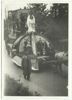 Optocht bij Bevrijdingsfeest te beek, 5 mei 1946 op feestwagen staat militair met wapen en vier 'krijgsgevangenen' met de handen omhoog.