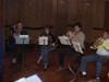 Foto van een dirigent voor een fanfare/ orkest (allen zittend) in een zaal