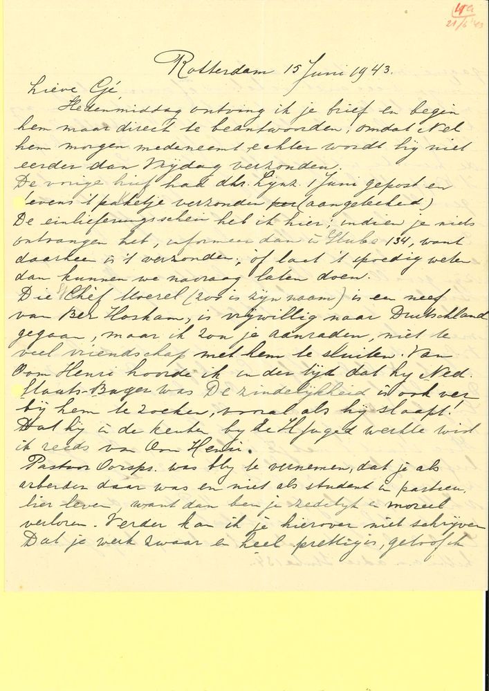 Brief van vader aan Gé Verbeek, 15 juni 1943, Rotterdam.