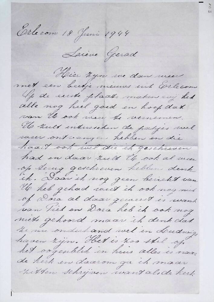 Brief in enveloppe. 18 juni 1944. Aan den heer Gerardus Christiaan Janssen. Per adres Machine Fabriek Boecher und Volkenborn Hohenlimburg in Westfalen.Verzameling brieven voor Gerard Janssen die tewerkgesteld was in Duitsland. Per adres Dicke Eichen Hohenlimburg in Westfalen.Een korte samenvatting van deze brief.Lieve Gerard. Wij maken het allemaal goed. Dat hopen wij ook van jouw te horen. Je hebt vast wel alle pakjes ontvangen en ook de kaart. Je hebt daar vast wel op teruggeschreven. Wij hebben nog geen enkel bericht gekregen. Ik weet ook niet of Piet en Dora al op bezoek zijn geweest. Ik heb nog niets van ze vernomen. Op het ogenblik is het hier erg stil. Iedereen is naar de kerk. Daarom ben ik maar gaan schrijven. Er is veel gebeden in de kerk voor vrede en dat de oorlog maar snel afgelopen mag zijn. Je bent nu al ongeveer een jaar weg. Ik hoor maar niets meer van verlof. Toon Sanders heeft acht dagen ziekteverlof gekregen. Het is hier erg slecht weer. Er groeit buiten bijna niets. Ik weet niet waar het naar toe moet. Met de visserij gaat het klooten. Ze gaan maar even niet vissen, ze hebben zondag gehouden. Heb je het pakje met zeeppoeder ontvangen. Geef dat maar aan Smieders, dat kan ze de was voor je doen. Wanneer je kapot goed hebt, stuur het dan maar weer naar huis. Het is ook erg stil in het café. We hebben geen bier. Het valt niet mee voor de jongens, ze zijn het zo gewoon om even binnen te wippen en aan het kraantje te draaien. Graske Arns is weer aan het vrijen geslagen. Hij heeft er de leeftijd voor. Ook Piet Arns zit vaak bij Grada Vermeulen. Herman Peters zwaait nog niet af van de Arbeidsdienst. Hij moet daar blijven. Willy Gillesen moet naar Duitsland om te gaan werken. Het is tegenwoordig erg druk in de lucht. Wij moeten regelmatig het bed uit en dat valt niet mee. Onze Nellie heeft een tand laten trekken. Ze heeft nog meer slechte tanden. Onze Jan krijgt een nieuw gebit. De kleine Beppie, Jopie en Ansje maken het goed. Ze groeien als kool. Nu moet ik weer gaan eindigen.