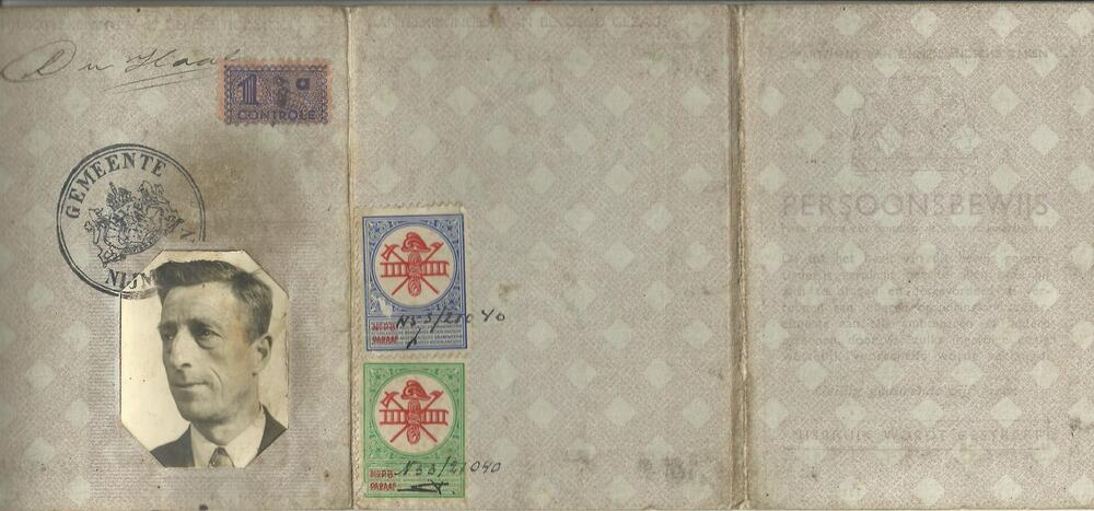 Persoonsbewijs op naam van Hol, Christina Arnolda J. "Geboren op 4 oktober 1907 te Nijmegen" "Afgegeven op 8 juli 1941 te Nijmegen" "no 027018" Persoonsbewijs met een foto"
