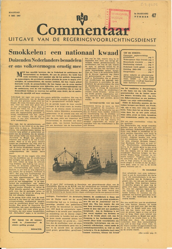 Commentaar, uitgave van de Regeringsvoorlichtingsdienst, 2e jaargang, no 49, 19 mei 1947.Smokkel, ook op de Rijn.H.M. de Koningin sprak te Woeste Hoeve.Ons volk mag de doden niet vergeten.Wederopbouw Rijk Overzee.De situatie in de Overzeesche gebiedsdelen.